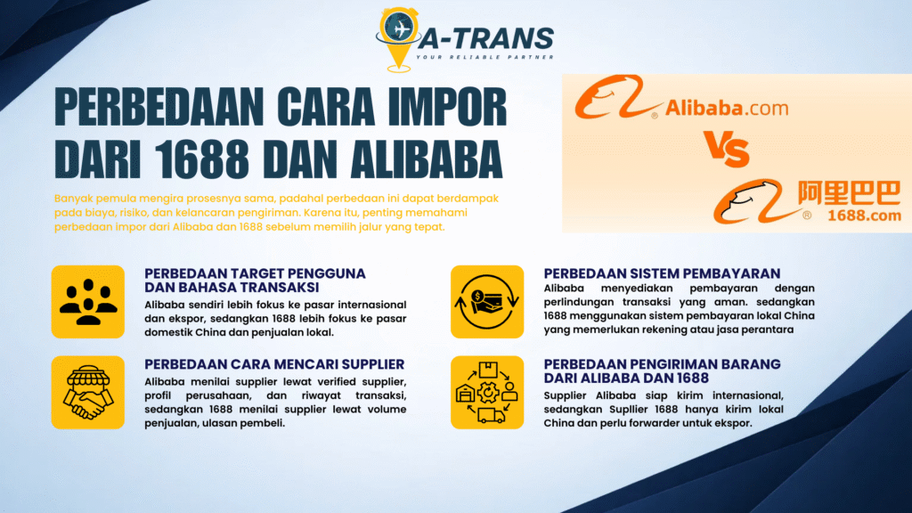 Mengetahui perbedaan cara impor barang dari Alibaba dan 1688 adalah langkah krusial sebelum memulai impor dari China. Perbedaan bahasa, harga, sistem pembayaran, hingga pengiriman membuat kedua platform ini tidak bisa diperlakukan dengan cara yang sama.